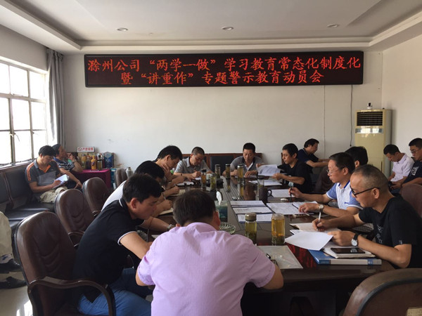 7月18日上午,滁州市公司召開全市“兩學一做” 學習教育常態化制度化暨“講重作”專題警示教育動員會,各縣(市)公司黨政負責人、市公司部門負責人以上人員及黨員、預備黨員、入黨積極分子參加了會議。會議由市公司副經理、副局長王春雷同志主持。