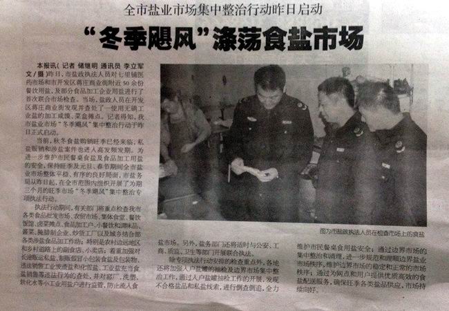 昨日,市鹽政執法人員對七里鋪醫藥市場和市開發區蔣莊商業街附近50余份餐飲用鹽,及部分食品加工企業用鹽進行了首次聯合市場檢查。當場,鹽政人員在開發區蔣莊商業街發現并查處了一使用無碘工業鹽的加工咸饃、菜盒攤點。記者得知,我市鹽業市場“冬季颶風”集中整治行動于昨日正式啟動。