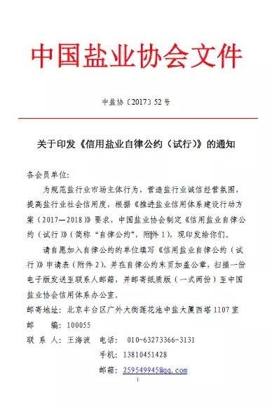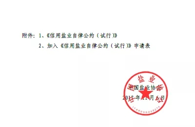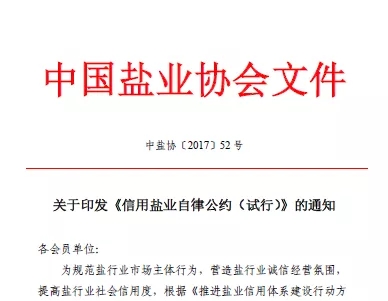2017年11月6日,為規范鹽行業市場主體行為,營造鹽行業誠信經營氛圍,提高鹽行業社會信用度,中國鹽業協會制定《信用鹽業自律公約(試行)》。該《自律公約》從守法合規、確保食鹽質量與安全、防止安全生產事故、堅持誠信經營、開展誠信文化建設、設立誠信管理機構等6方面進行行業自律。各食鹽定點批發企業、食鹽定點生產企業和中國鹽業協會會員單位可自愿加入信用鹽業自律公約。
