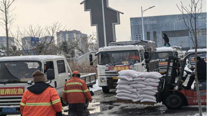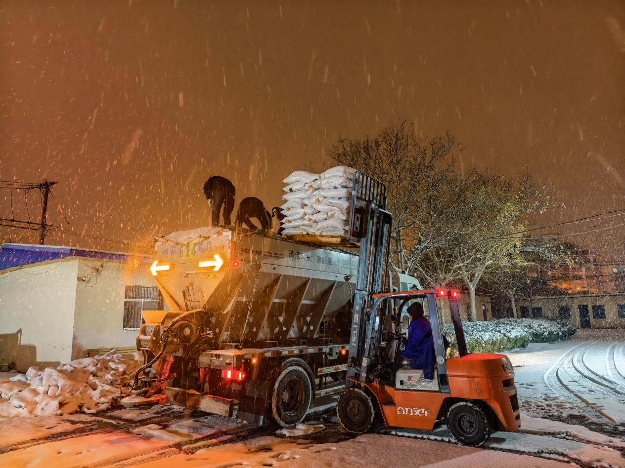 淮南市鹽業公司與應急保障人員協同作業,搶運融雪鹽